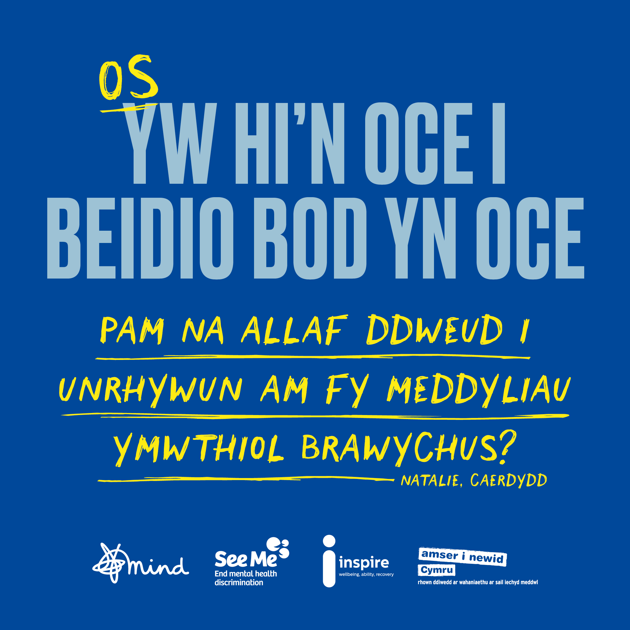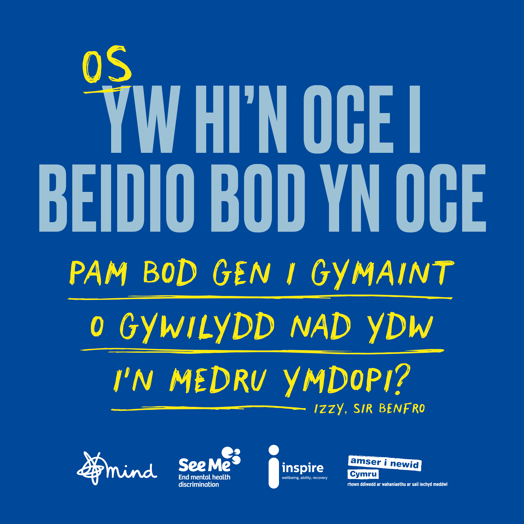 - Dangoswch eich cefnogaeth trwy rannu asedau 'Os yw'n iawn...' ar gyfryngau cymdeithasol. Lawrlwythwch nhw isod a defnyddiwch #OsYwHinOce a dilynwch ni ar X (Twitter gynt), Facebook ac Instagram.